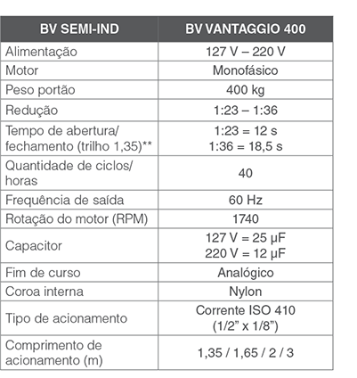 O automatizador BV HOME é indicado para portões basculantes residenciais de até 300 kg, podendo fazer até 30 ciclos (abertura e fechamento) por hora. Possui trilho centralizado (acoplado no centro do motorr